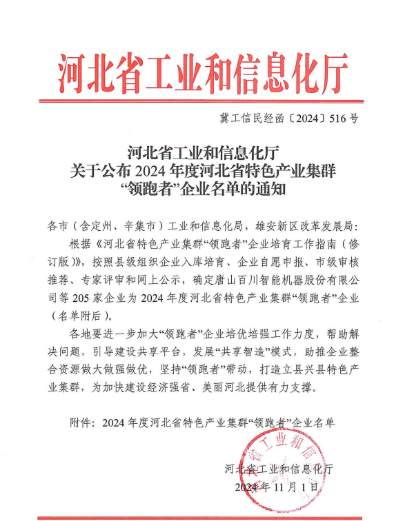 近日,省工信廳公布了2024年度河北省特色產業集群“領跑者”企業名單,我公司名列其間。